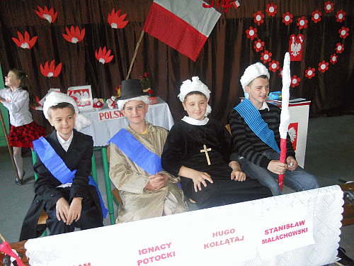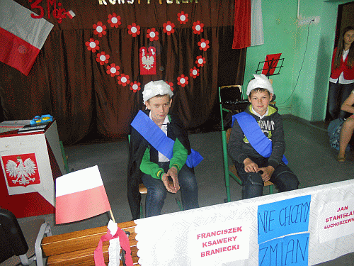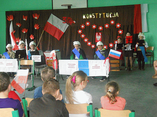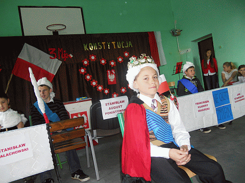 Zaprezentowano scenę ukazującą obrady Sejmu Czteroletniego z 1791 roku. Przedstawiono przeciwne sobie stronnictwa: patriotyczne i hetmańskie. Obserwatorzy akademii mieli okazję zapoznać się z ważnymi nazwiskami oraz faktami historycznymi. Dwoje uczniów pięknie zaśpiewało pieśń patriotyczną -,,Mazurka 3 Maja`. Trzecia osoba z rodzeństwa - Alicja Dobrowolska, grała na klarnecie akompaniament. Nie zabrakło też recytacji wierszy związanych z wydarzeniem.