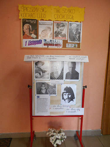 Pod koniec października 2014 r. z okazji Wszystkich Świętych uczniowie naszej szkoły pod kierunkiem p. Haliny Bogóskiej przygotowali gazetkę pamiątkową upamiętniającą tych, którzy odeszli z naszego świata.