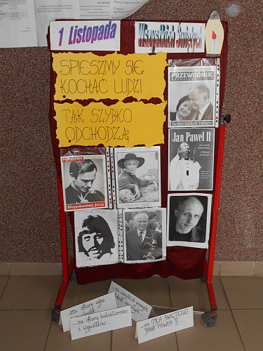 Dnia 29.10.2015 r. p. Halina Bogóska z Samorządem Szkolnym przygotowała gazetkę poświęconą zbliżającemu się wydarzeniu, jakim jest Wszystkich Świętych. Przechodząc korytarzem szkolnym, przypominamy sobie o tym, że wszyscy odchodzą a ich duszom można poświecić swoją modlitwę oraz płomień palącego się znicza.