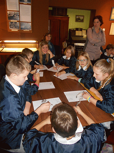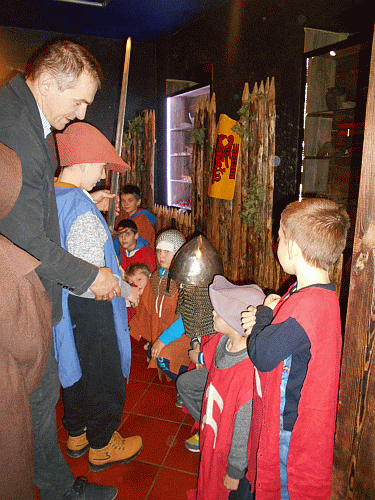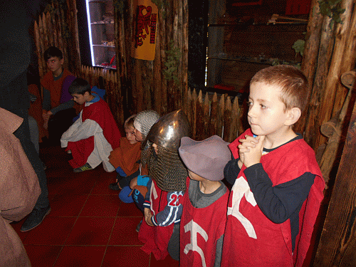 Lekcja muzealna przedstawiała przekrój społeczeństwa średniowiecznego. Wzbogacona była o prezentacje strojów z epoki, scenkę pasowania na rycerza oraz własnoręczne malowanie figurki rycerza Bożogrobcy (każdy uczeń otrzymał figurkę na własność).