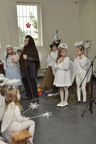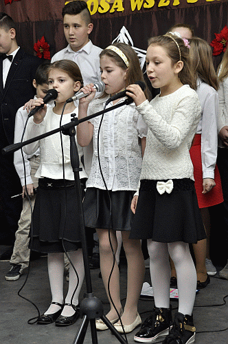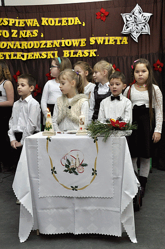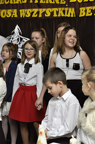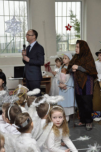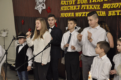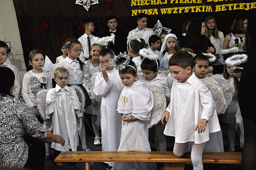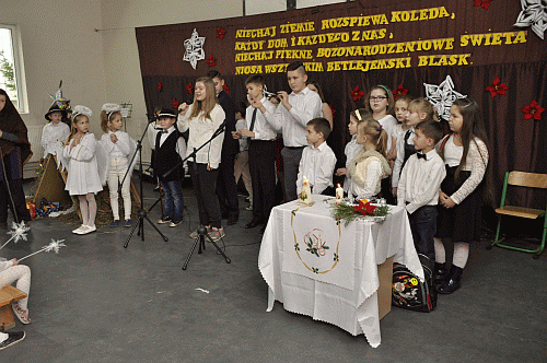Wszyscy zachwyceni byli pięknym występem dzieci oraz licznymi dekoracjami ozdobionej sali gimnastycznej. Uczniowie pięknie śpiewali kolędy oraz pastorałki, odegrali role istotne dla wydarzenia związanego z narodzinami Jezusa Chrystusa. Podczas kiermaszu udało się uzyskać dużą sumę pieniędzy, która przeznaczona będzie na potrzeby uczniów ze Szkoły Podstawowej w Zajeziorzu. W rodzinnej atmosferze składaliśmy sobie życzenia i symbolicznie łamaliśmy się opłatkiem. Zaszczyciła nas swoją obecnością sekretarz gminy, p. Maria Kulig.