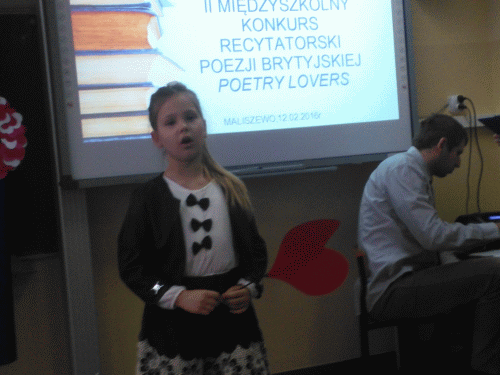 Dnia 12 lutego 2016 r. uczniowie naszej szkoły spróbowali swoich sił w konkursie poezji angielskiej "Poetry Lovers" w Maliszewie. Klasy I-III reprezentowała Sara Noemi Karwecka, natomiast kl. IV-VI Martyna Bogóska. Uczennice zaprezentowały się wspaniale, obejrzały występy specjalnie przygotowane przez dzieci z Maliszewa i integrowały się z innymi uczestnikami konkursu. Wróciły na pewno bogatsze w nowe doświadczenia i zapał do dalszej pracy. Nad przygotowaniami do konkursu czuwała anglistka p. Karolina Kiełbowicz.