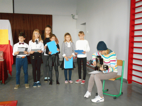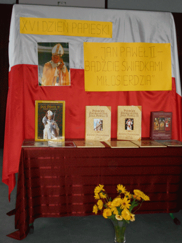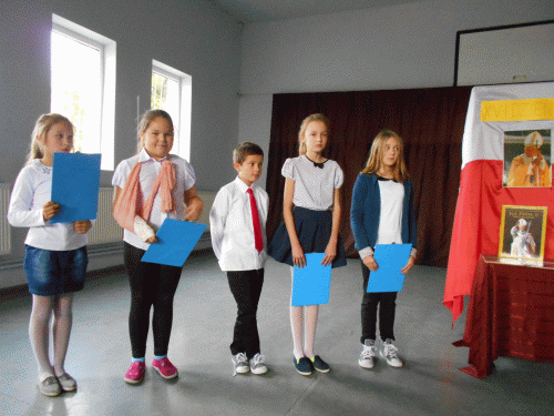 Dnia 19.10. 2016 r. w naszej szkole uczczono pamięć Jana Pawła II podczas XVI DNIA PAPIESKIEGO. Montaż słowno `“ muzyczny został przygotowany przez katechetkę `“ p. Halinę Bogóską i nauczycielkę muzyki `“ p. Katarzynę Rybczyńską. Starsi uczniowie wzruszyli nas swoją recytacją oraz śpiewem dla żywego duchem Papieża Polaka. Wszystkie utwory śpiewano przy akompaniamencie gitary.