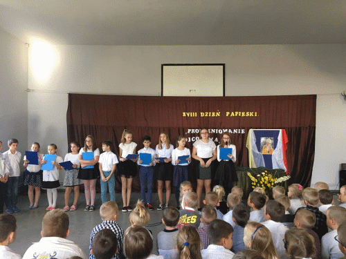 Dnia 14 października obchodzony był XVIII Dzień Papieski pod hasłem "PROMIENIOWANIE OJCOSTWA". Uczniowie naszej szkoły wystąpili podczas Mszy Świętej w kościele parafialnym w Ciepieniu z montażem słowno- muzycznym, upamiętniając 40 rocznicę wyboru Karola Wojtyły na stolicę Piotrową. Ten szczególny dzień obchodzony był w radosnej atmosferze związanej z 100 rocznicą odzyskania niepodległości przez naszą Ojczyznę. Ksiądz proboszcz serdecznie podziękował uczniom, a wierni nagrodzili uczniów licznymi brawami. 17 października o tej samej treści odbył się apel w naszej szkole.
