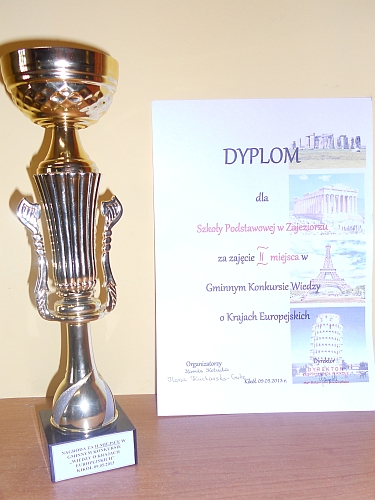 Dnia 09.05. 2013 r. starsi uczniowie naszej szkoły, widoczni na zdjęciu, wyjechali z opiekunem wycieczki, p. Karoliną Kiełbowicz do Kikoła na zorganizowany tam konkurs. Dzieci wróciły z wyjazdu z pucharem i dyplomem za zajęcie II miejsca w Gminnym Konkursie Wiedzy o Krajach Europejskich. Nastrój zwycięstwa jest motywacją do pracy dla pozostałych uczniów.