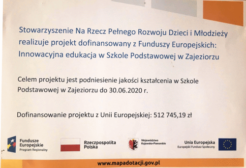 Szkoła Podstawowa w Zajeziorzu bierze udział w Projekcie ``Innowacyjna edukacja w Szkole Podstawowej w Zajeziorzu`, w ramach Regionalnego Programu Operacyjnego Województwa Kujawsko-Pomorskiego na lata 2014-2020, który jest dofinansowany przez Unię Europejską w ramach Europejskiego Funduszu Społecznego. Projekt jest realizowany w okresie od 09.05.2019r. do 30.06.2020r.