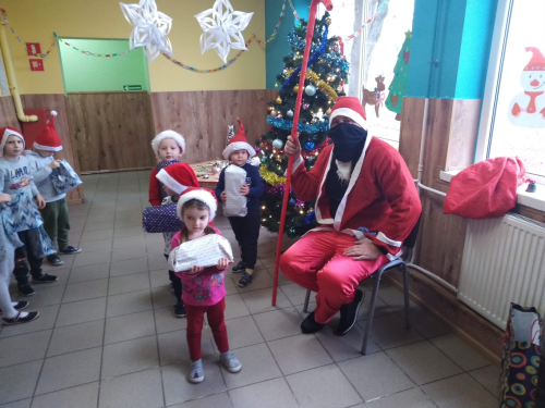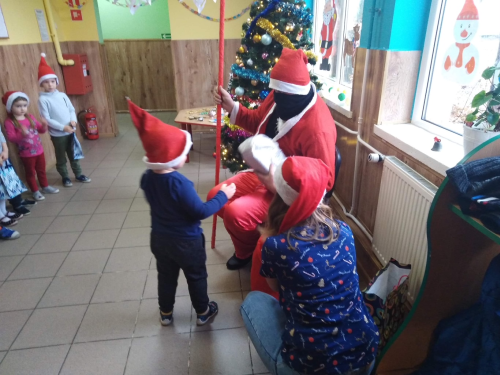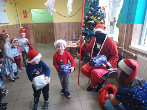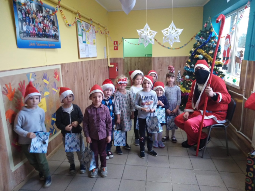 Kiedy nieoczekiwanie na korytarzu rozległ się dźwięk dzwonków Mikołaja Przedszkolaki od razu zaczęły podskakiwać z radości. Św. Mikołaj został gorąco przywitany. Miło spędzony czas uświetniły prezenty wręczane każdemu dziecku przez Mikołaja.