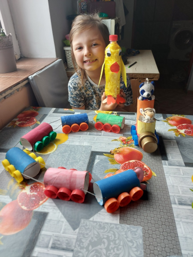 - uczniowie klasy I wykonali ``EKO- zabawki` z materiałów z recyklingu. Przedmioty takie, jak np. kartonowe pudełka, plastikowe butelki, skrawki materiałów po ich wykorzystaniu zgodnie z pierwotnym przeznaczeniem, otrzymały swoje drugie życie, a dzieci zyskały nowe zabawki, dzięki czemu odciążyły naszą Planetę od nadmiaru śmieci.