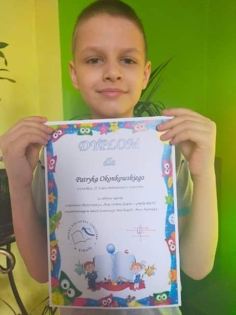 Kilkoro uczniów z klasy 2 wzięło udział w konkursie plastycznym pod hasłem "Moja ulubiona książka - projekt okładki" zorganizowanym przez Gminną Bibliotekę Publiczną w Kikole. Praca naszego ucznia Patryka Okonkowskiego została wyróżniona. Chłopiec otrzymał dyplom oraz nagrodę rzeczową. Gratulujemy Patrykowi i życzymy dalszych sukcesów i osiągnięć.