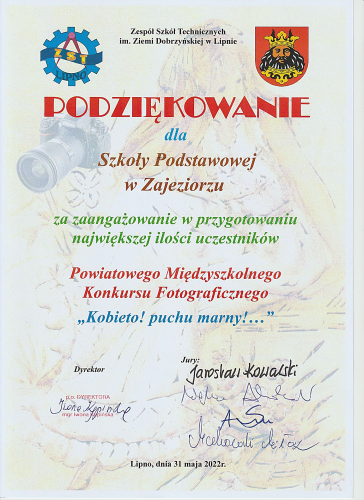 Zespół Szkół Technicznych im. Ziemi Dobrzyńskiej w Lipnie był organizatorem Powiatowego Międzyszkolnego Konkursu Fotograficznego pn. "Kobieto! puchu marny! ...". W konkursie brało udział dziesięcioro uczniów Szkoły Podstawowej w Zajeziorzu: Bartosz Sadowski, Bartosz Sobolewski i Julia Wołowska z klasy IV, Wojciech Bonowicz z klasy V, Szymon Madzierski, Zuzanna Szafrańska i Oliwier Wenderlich z klasy VI, Michał Dobrowolski z klasy VII oraz Julia Grabowska i Julia Sadowska z klasy VIII. Julia Sadowska i Bartosz Sadowski za swoje zdjęcia zostali wyróżnieni - Gratulujemy!
