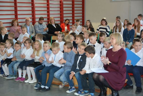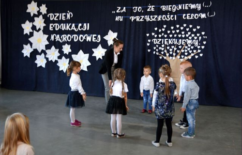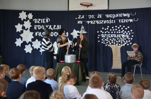 W części artystycznej udział brali uczniowie klas II-III oraz z klasy IV- VIII pod kierunkiem nauczycieli, tj. Pani Moniki Kowalskiej, Pani Bożeny Palińskiej oraz Pani Małgorzaty Borkowskiej. Swój udział w akademii takie miały maluszki z Młodszego Oddziału Przedszkolnego wraz z 5-latkami, które przygotowała Pani Sylwia Kowalska. Uczniowie prezentując scenkę satyryczną, piosenki i życzenia wyrazili swoje podziękowanie i słowa uznania dla trudnej pracy pedagogów.