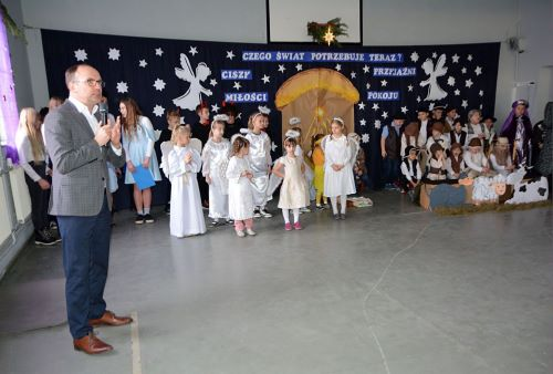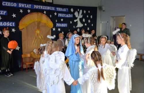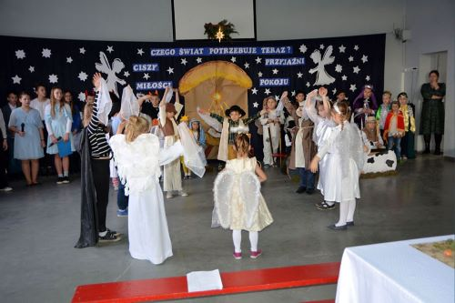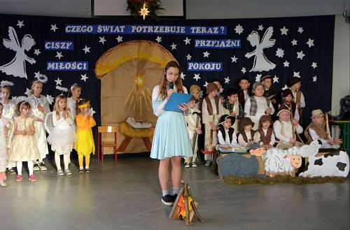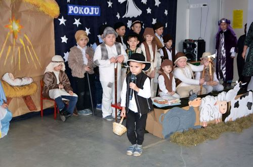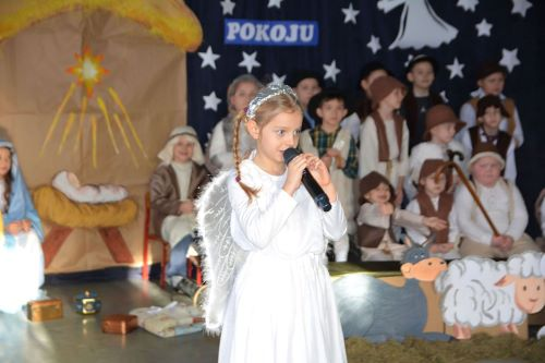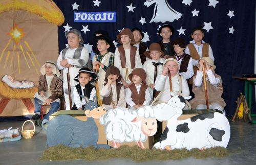 Ze Świętami Bożego Narodzenia wiąże się wiele pięknych tradycji i zwyczajów. Jednym z nich jest odgrywanie inscenizacji o Bożym Narodzeniu zwanych Jasełkami. W tym roku świąteczna atmosferę stworzyli uczniowie z klas I-II, dzieci z oddziałów przedszkolnych wraz z chórem uczniów z starszych klas. Dzieci przypomniały wszystkim wydarzenia sprzed ponad dwóch tysięcy lat, kiedy to w Betlejem narodziło się Boże Dzieciątko. Wcieliły się w role Maryi i Józefa, pasterzy, aniołów, trzech króli, przybywających złożyć pokłon Jezusowi narodzonemu w ubogiej stajence. Uroku inscenizacji dodały tańce najmłodszych dzieci. Uroczystość wraz z dekoracją przygotowały Panie: Monika Bonowicz, Sylwia Kowalska oraz Elżbieta Chyzińska.