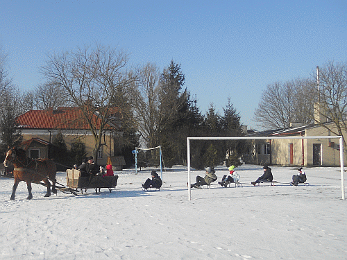 W kolejny dzień (04.02.2014 r.) zaproszono do szkoły p. Ignacego Skowrońskiego, który bezinteresownie przygotował dla dzieci powózkę konną. Poza tym uczniowie zjeżdżali na sankach i bawili się śnieżkami. Nad ich bezpieczeństwem czuwali: dyrektor szkoły `“ p. Zbigniew Bogóski, p. Karolina Leżyńska i p. Tomasz Małecki.